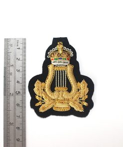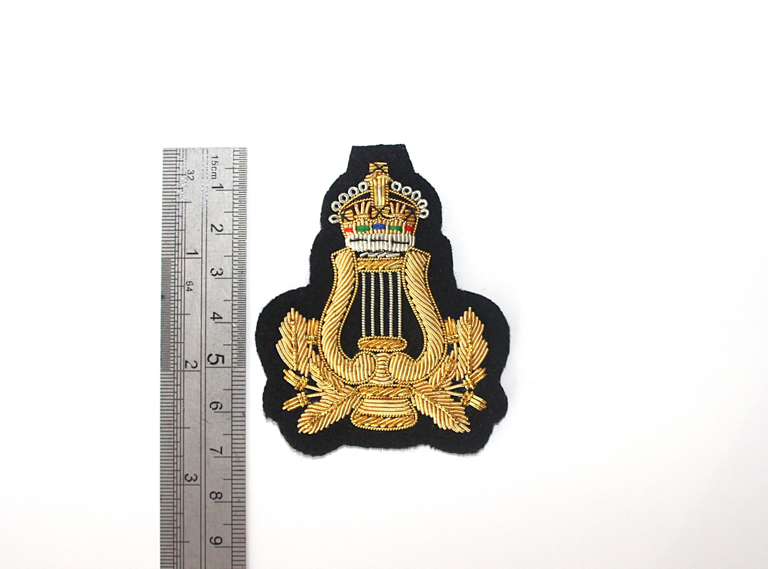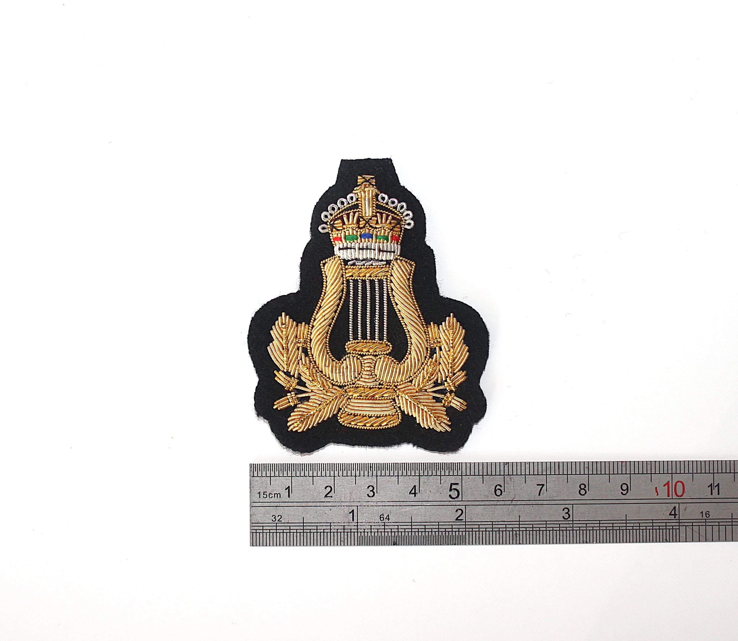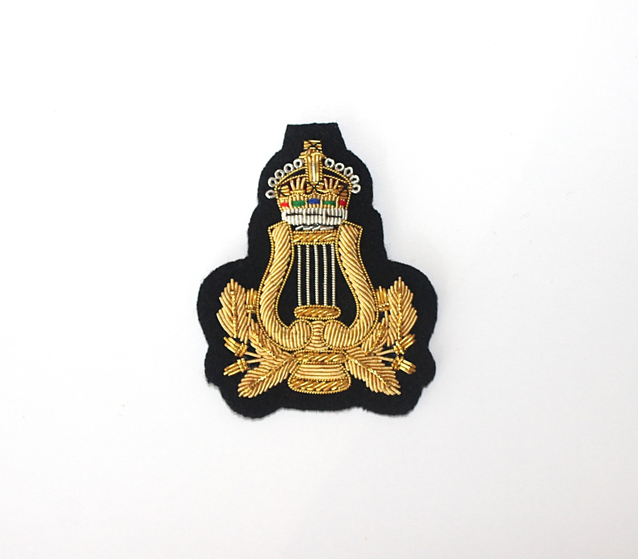 Musicians Lyre Badge with Kings Crown. Hand Embroidered, Gold on Black