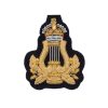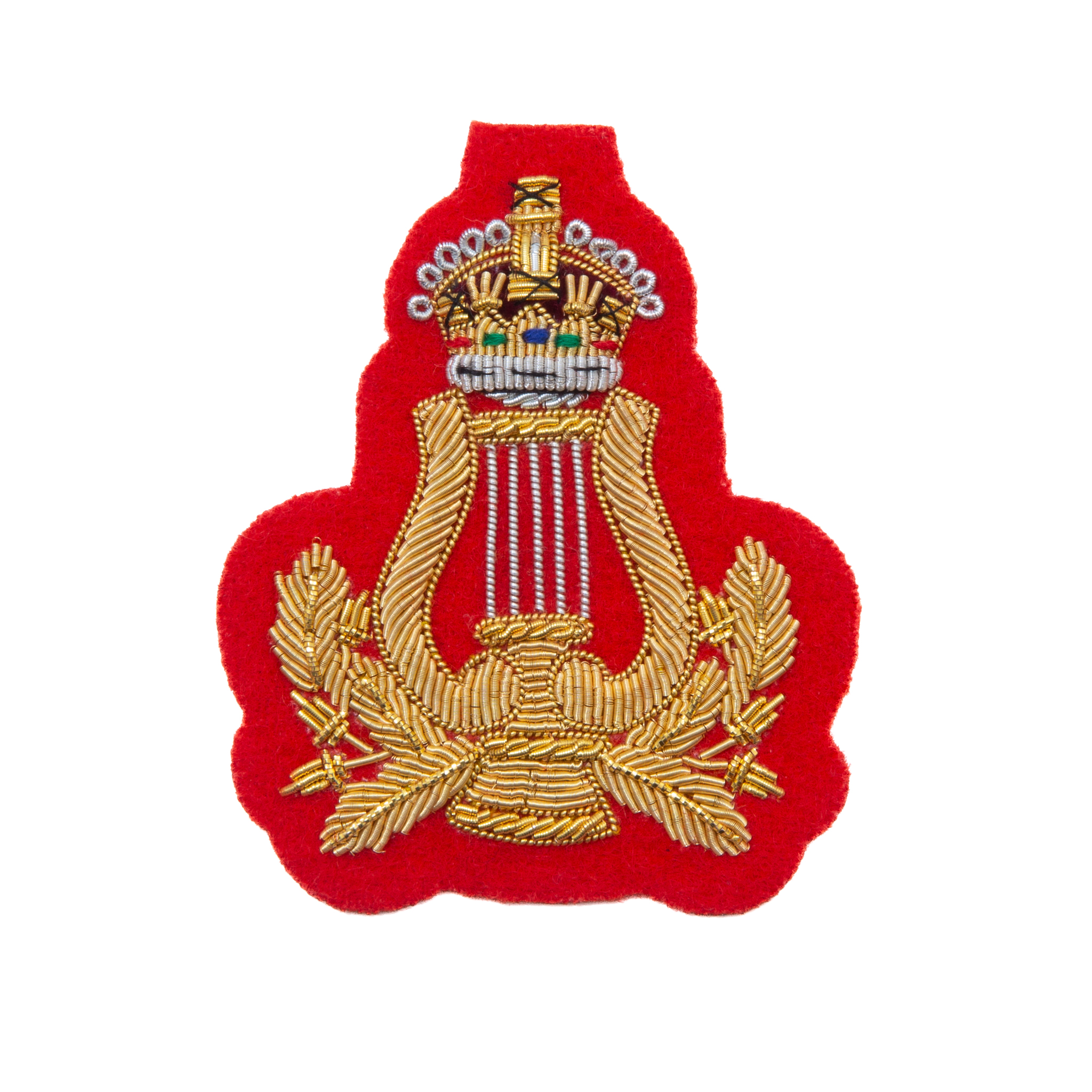 Musicians Lyre Badge with Kings Crown. Hand Embroidered, Gold on Red